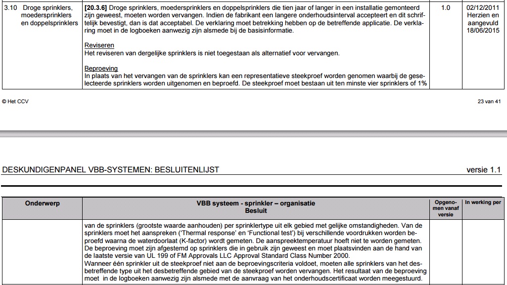 Het CCV heeft een aangepaste besluitenlijst versie 1.1 gepubliceerd met daarin de herziene tekst van Onderhoud en beheer van droge sprinklers, moedersprinklers en doppelsprinklers (besluit 3.10).